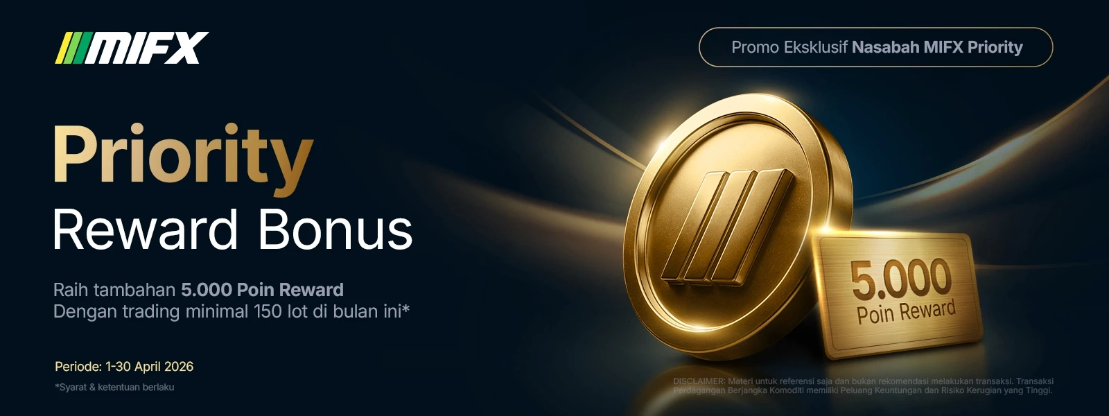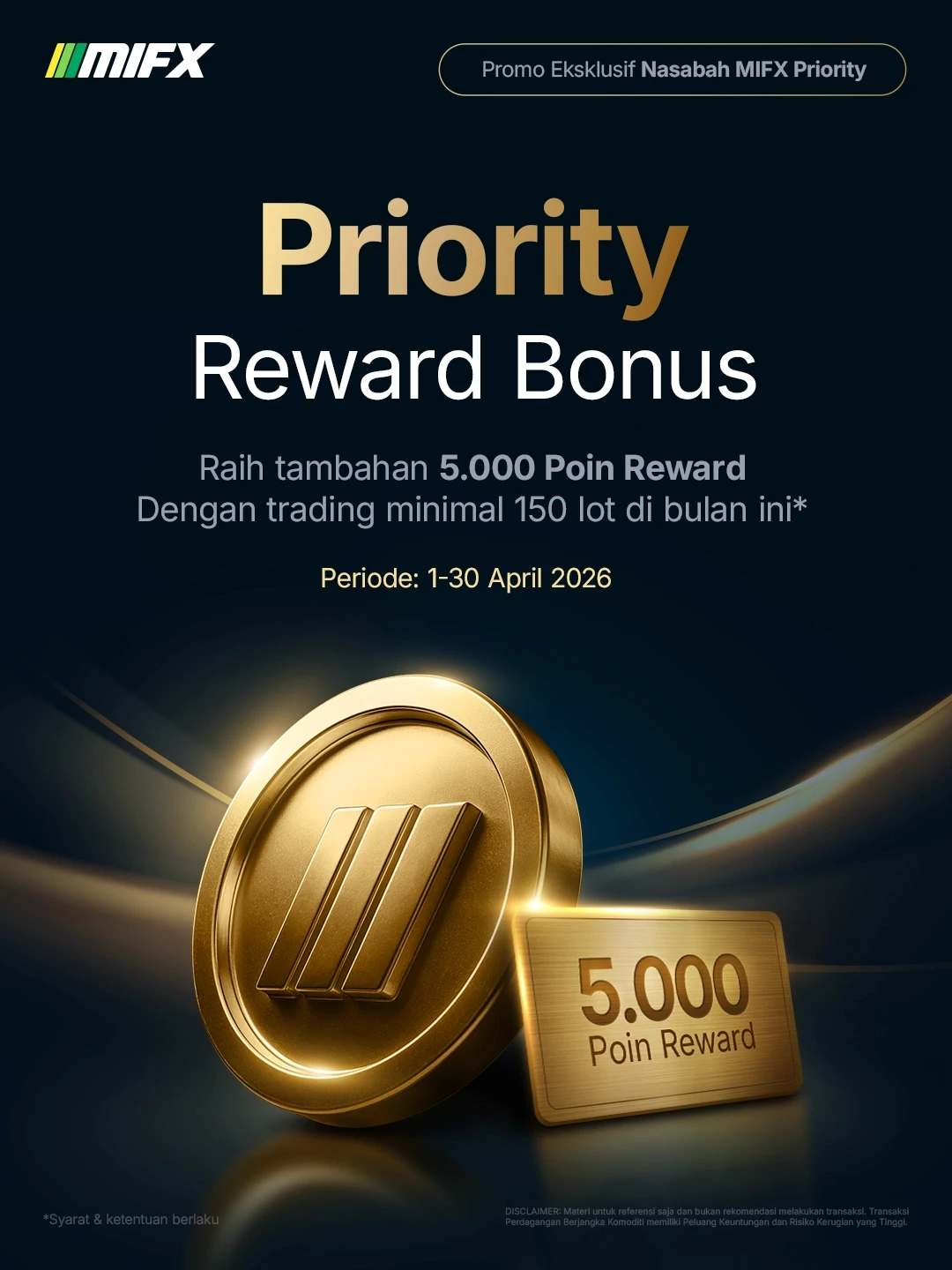 MIFX Priority Reward Bonus 2026 adalah sebuah program promo yang memberikan hadiah berupa 5.000 Poin Reward MIFX. Poin ini nantinya dapat ditukarkan dengan hadiah yang tersedia di program Poin Reward. Nasabah bisa mendapatkan Poin Reward dengan melakukan trading hingga mencapai target 150 lot side selama periode program berlangsung. Semua keputusan Penyelenggara dalam program ini bersifat final dan tidak dapat diganggu gugat.
