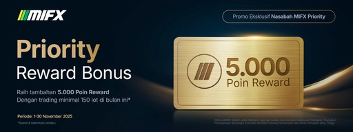 MIFX Priority Reward Bonus 2026 adalah sebuah program promo yang memberikan hadiah berupa 5.000 Poin Reward MIFX. Poin ini nantinya dapat ditukarkan dengan hadiah yang tersedia di program Poin Reward. Nasabah bisa mendapatkan Poin Reward dengan melakukan trading hingga mencapai target 150 lot side selama periode program berlangsung. Semua keputusan Penyelenggara dalam program ini bersifat final dan tidak dapat diganggu gugat.