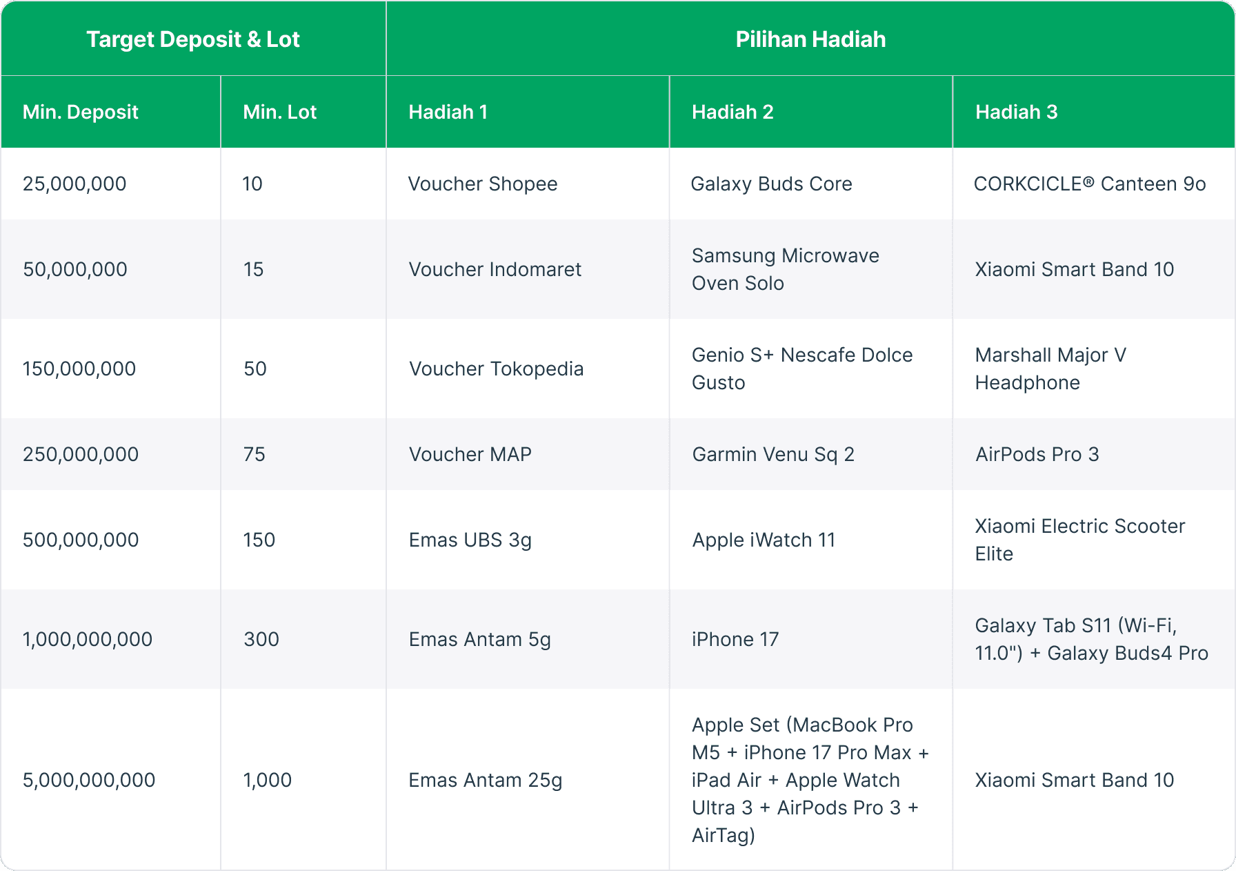 Tentukan nominal deposit awal, lalu selesaikan target lot dalam 30 hari untuk raih hadiahnya.