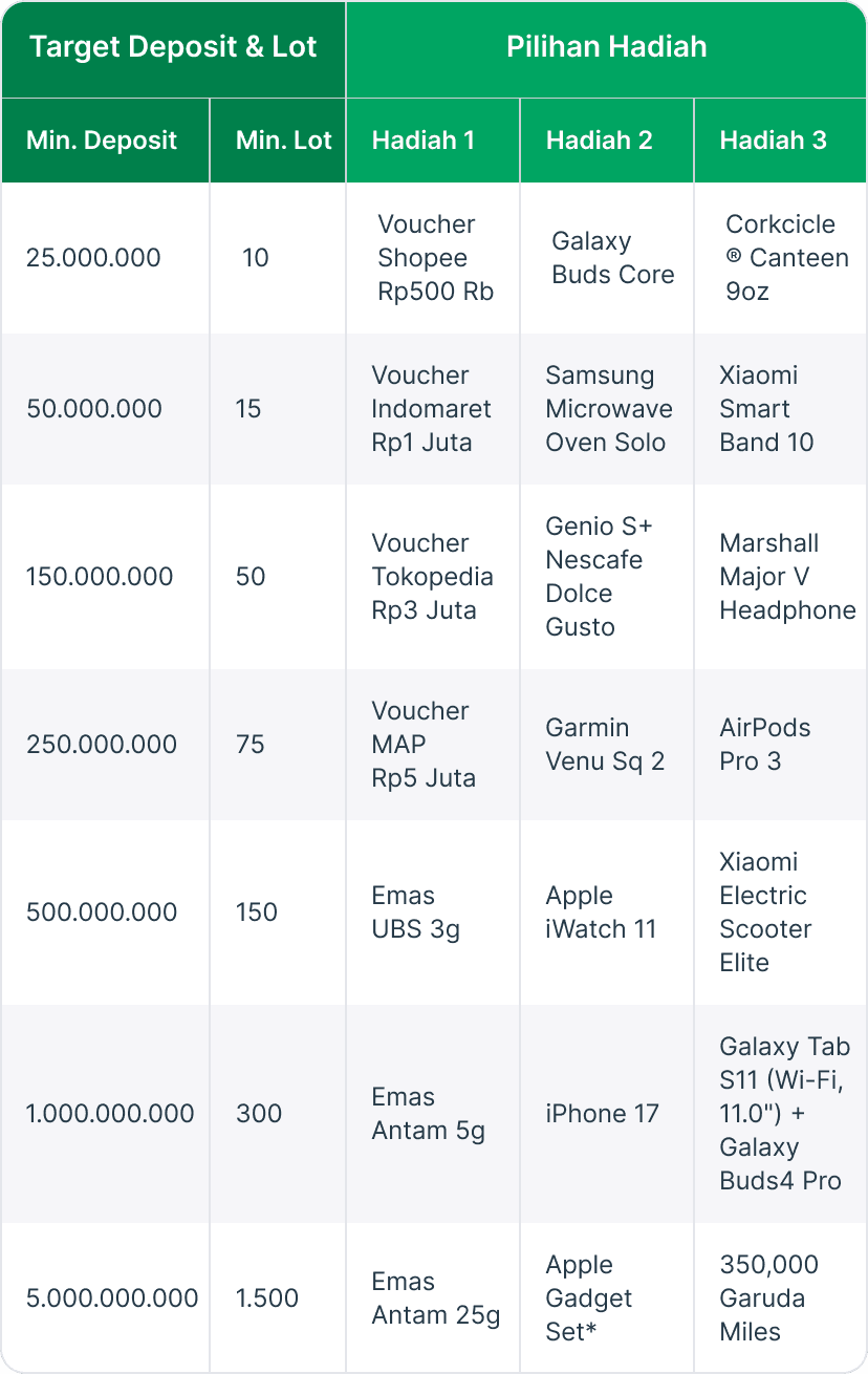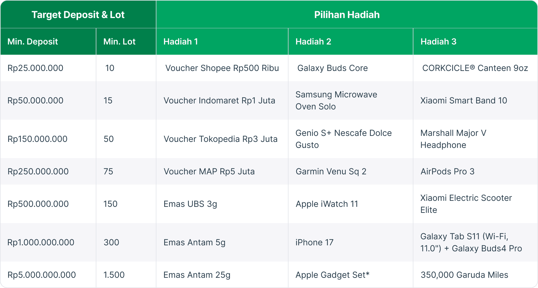 Mulai trading kini lebih menguntungkan dengan berbagai hadiah yang dapat Anda pilih. Tentukan nominal deposit awal, lalu selesaikan target lot dalam 30 hari untuk raih hadiahnya.