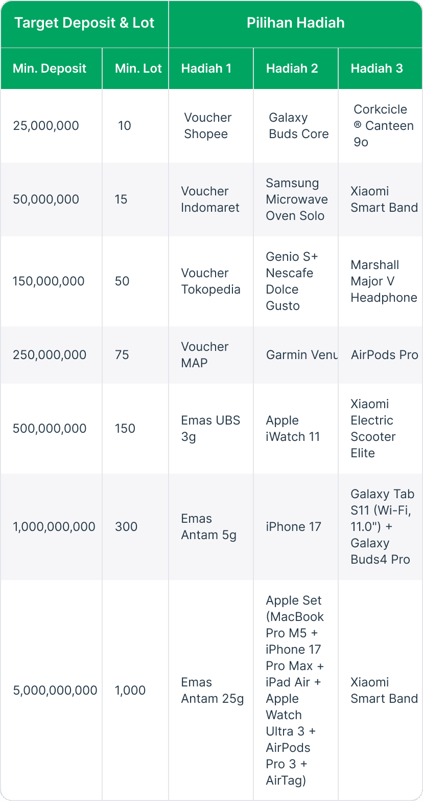 Dapatkan hadiah jika telah berhasil mencapai target minimum lot yang ditentukan.